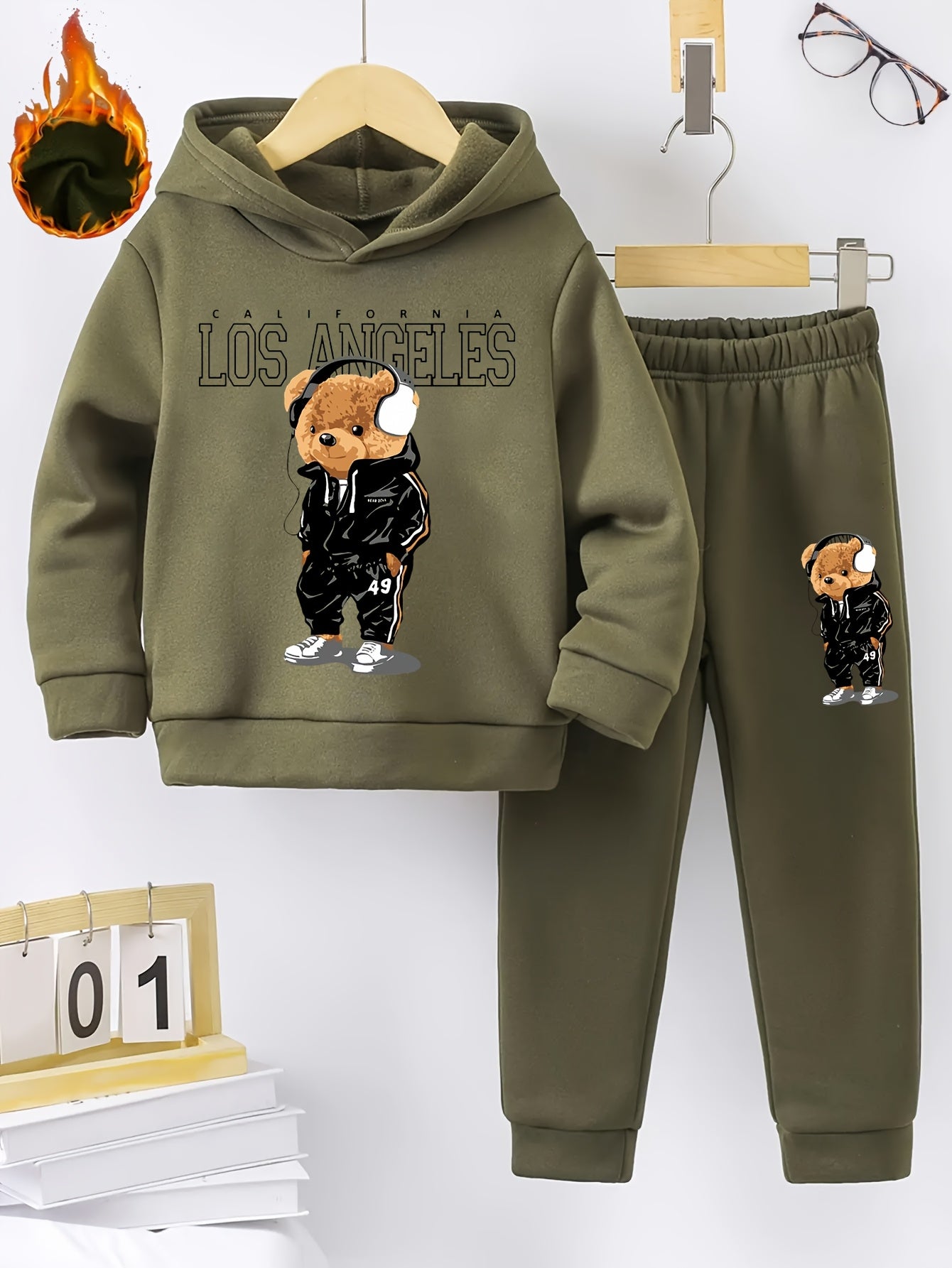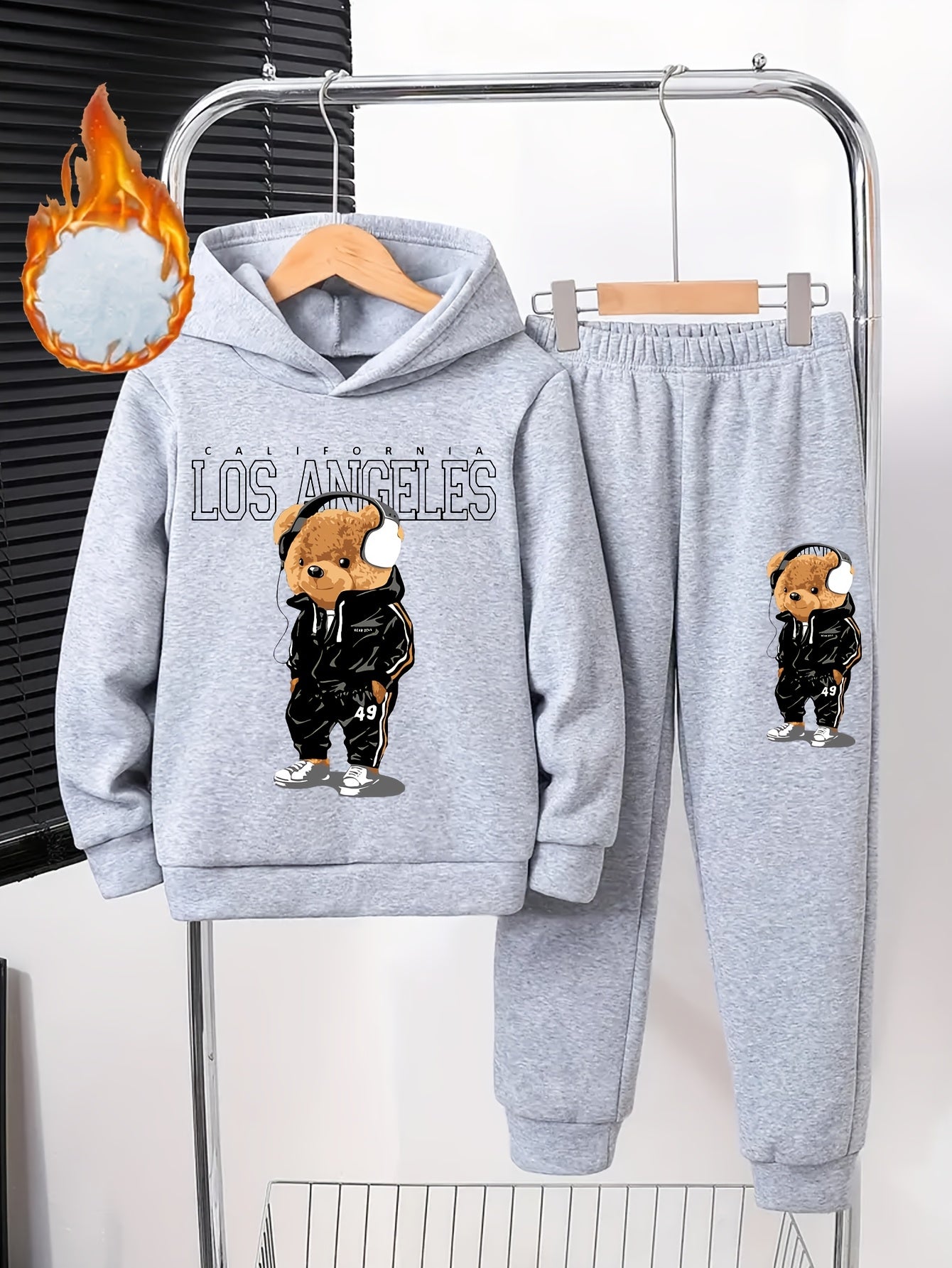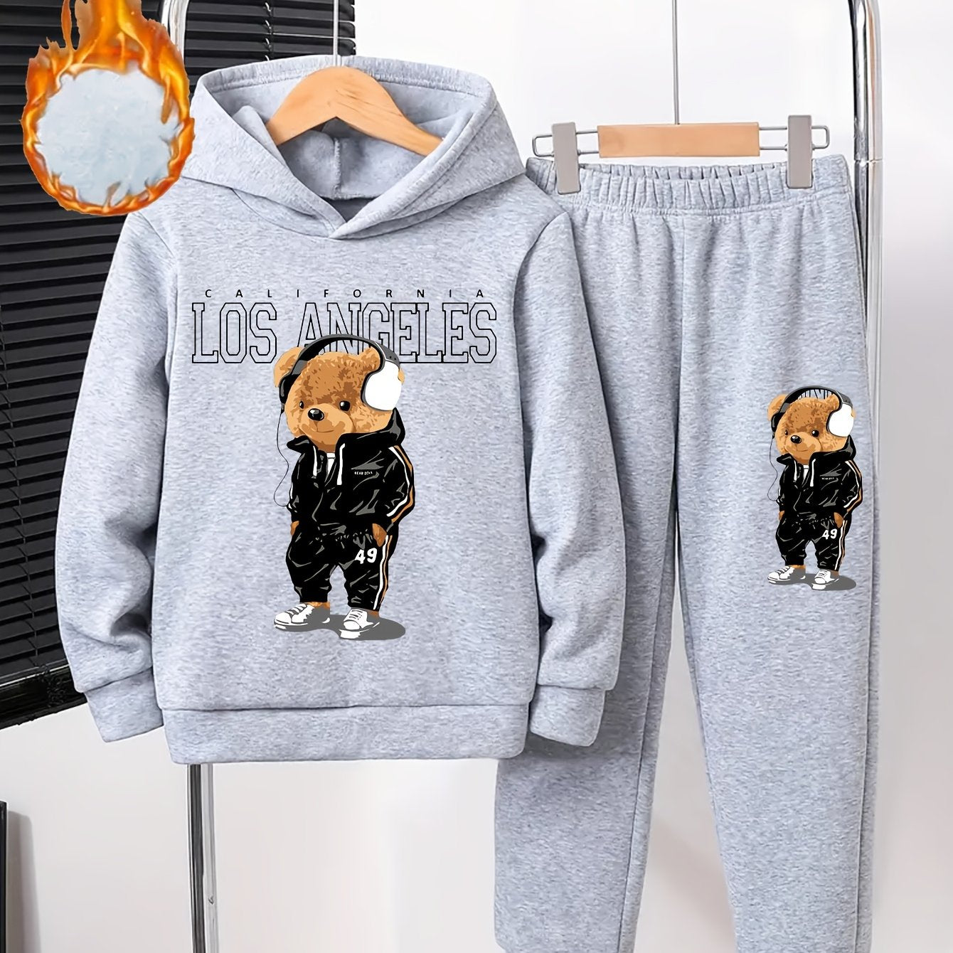 Boys' Cozy Fleece-Lined Hoodie & Joggers Set with Cool Cartoon Bear Print -