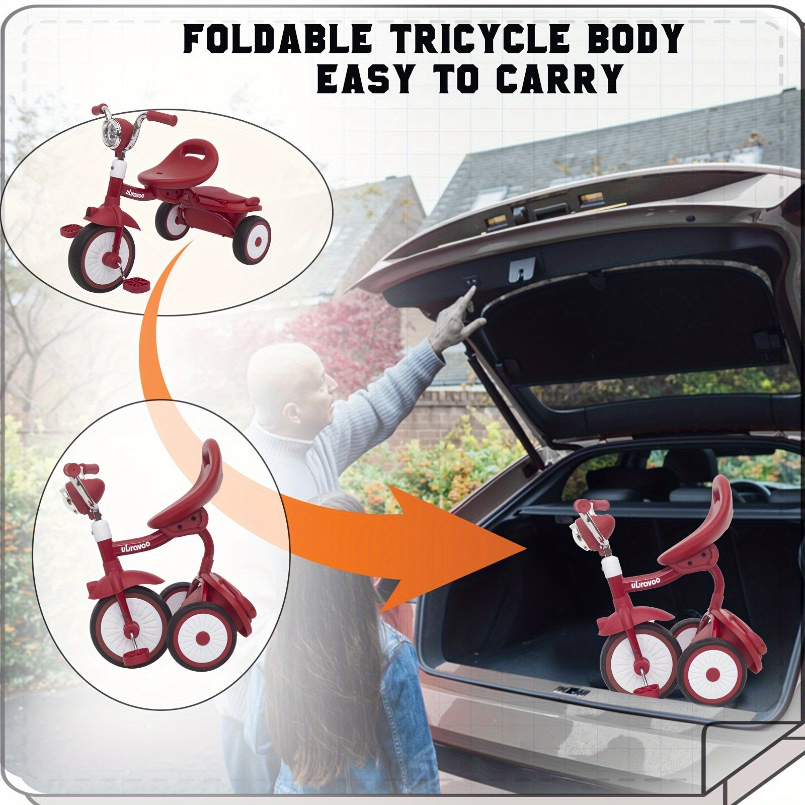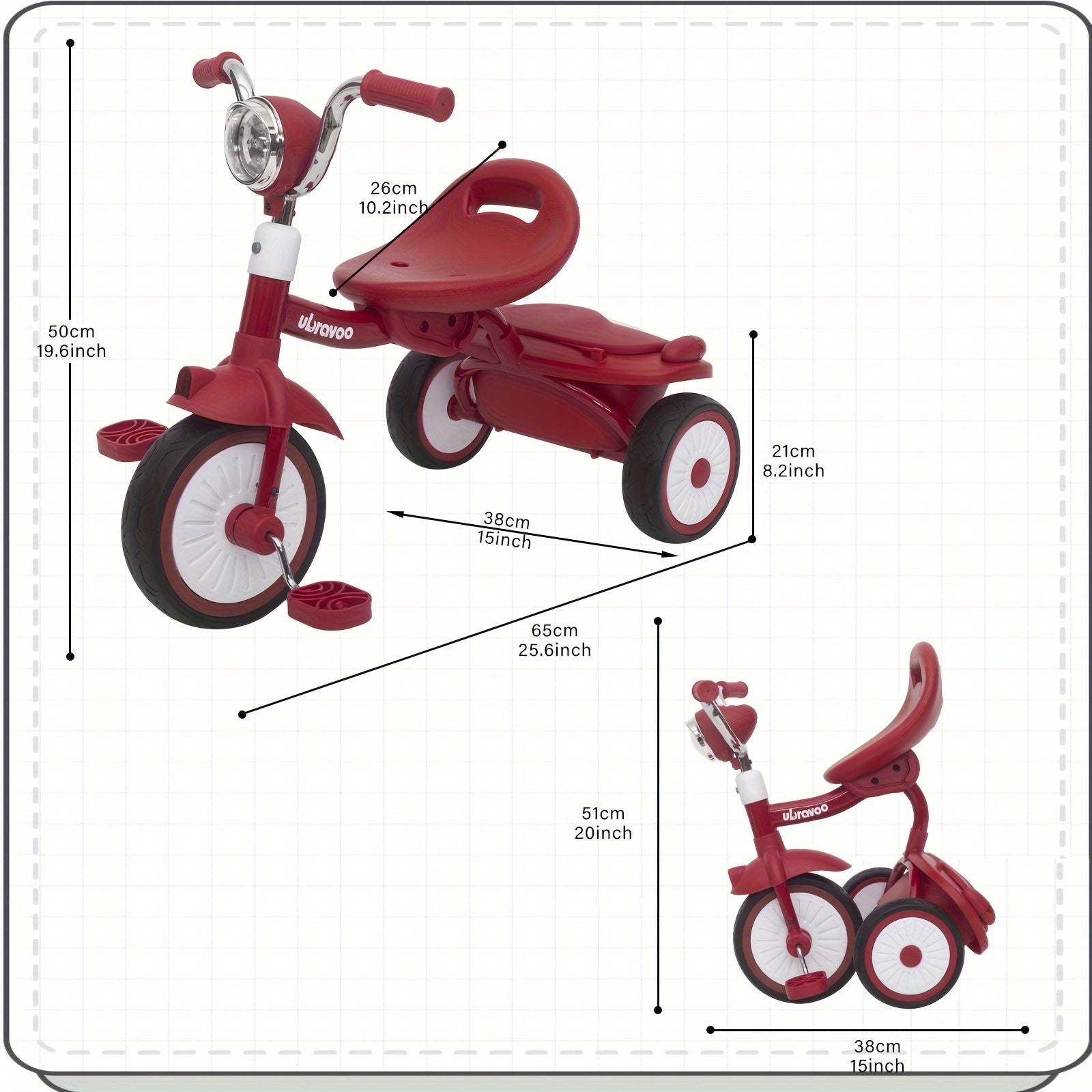 UBRAVOO Baby First Walker Trike for 1-5 Years Old Girls,Boys Unisex,Children Foldable Tricycle Bike:Unique PU wheels with elasticity, shock absorption effect,good grip,not easy to slip, wear-resistant,and comfort is good, perfect for various road conditions. Front wheel size:20cm/7.87inch. Rear wheel size:15cm/5.91inch.Unfolded size: 65 x 50 x 38 cm.Folded size: 51 x 38 x 38 cm. Weight: 4.4 kg . Durable Wheels and Comfortable Seat.The saddle of the toddler trike can be adjusted back and forth.
