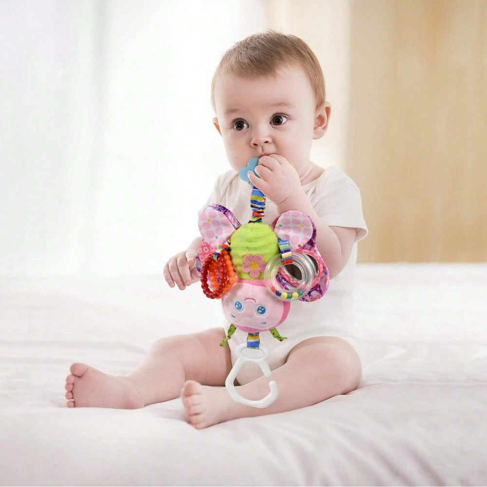 Infant Stroller Hanging Toy with Ringing Bell – Plush Cartoon Butterfly with Teething Rings,