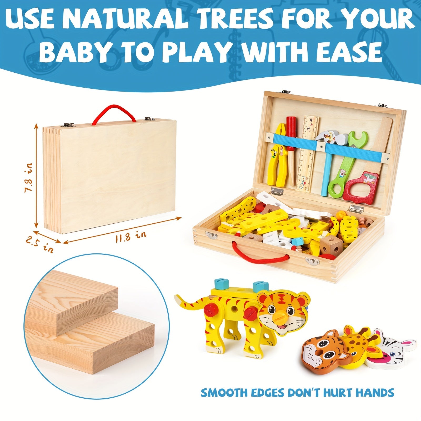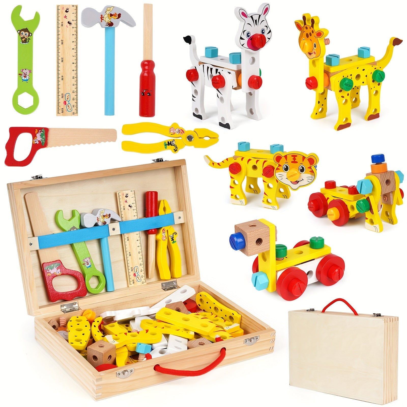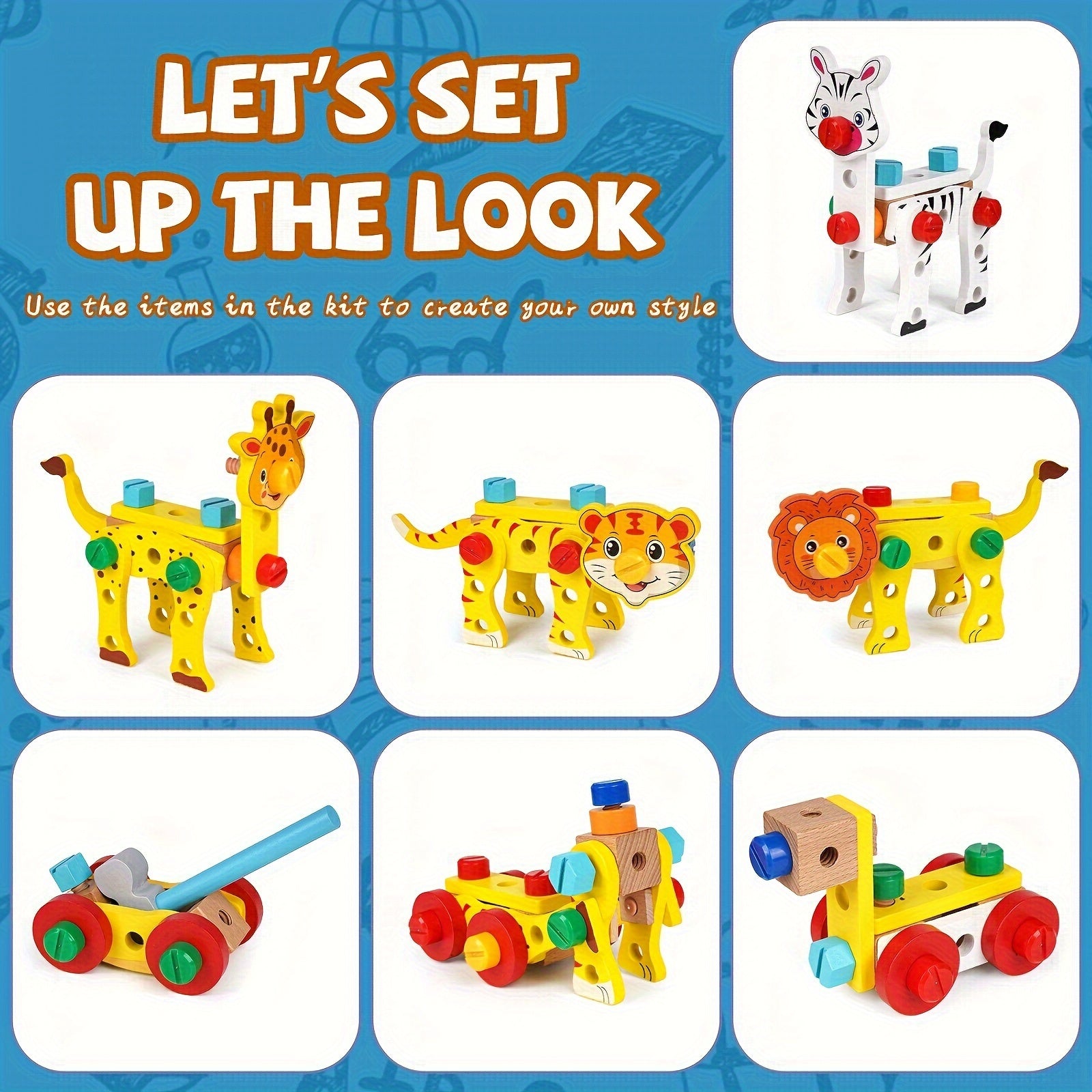 Wooden Kids Tool Kit and DIY Animal Building Block Toy,